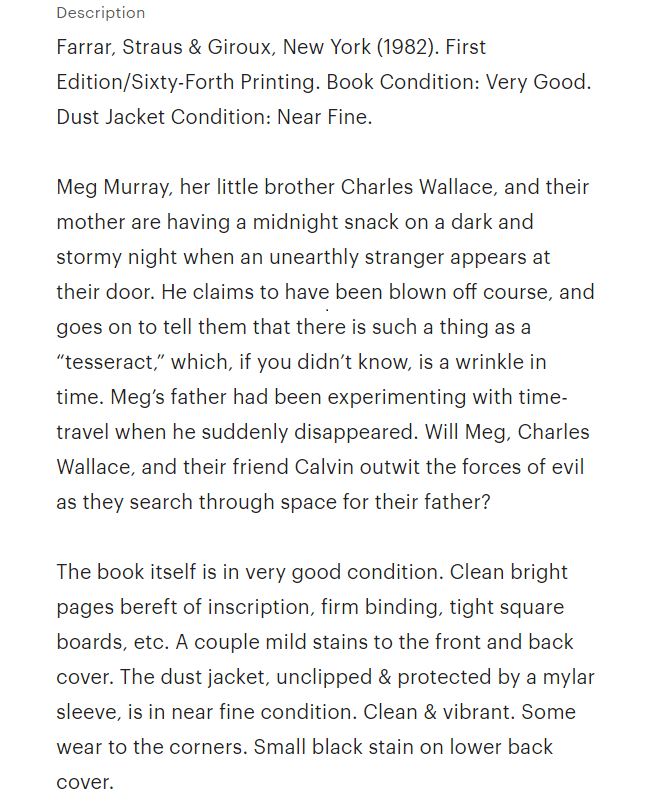 - Describe the book in great detail. It is best to describe the condition of the book in as much detail as possible, warts and all. If there is a flaw with the book, such as a tear in the dust jacket or underlining on the pages, include it in the description. Otherwise you risk having the book returned and/or receiving a negative review on your shop. I recommend adding a brief description of the general plot as well. Longer listing descriptions make your shop look more professional, and can ultimately lead to higher sales. For an example, I’ve included a screenshot of my description for Madeleine L’Engle’s “A Wrinkle in Time,” which I’m currently selling on my site.